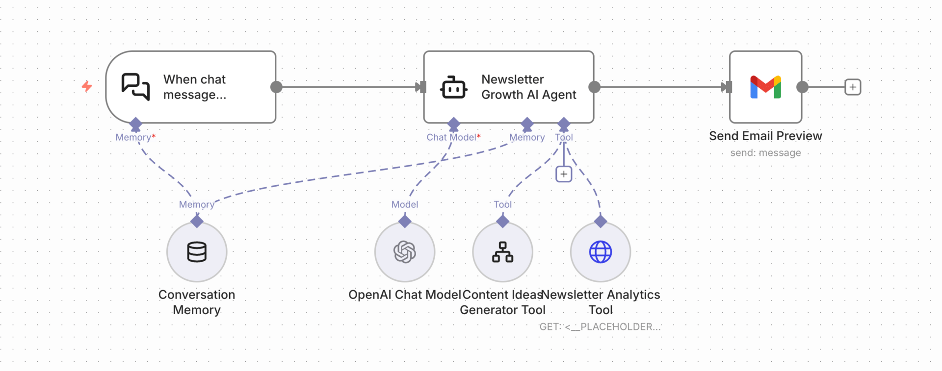 A full multi-step workflow. With memory. With tools. With a Gmail preview.
